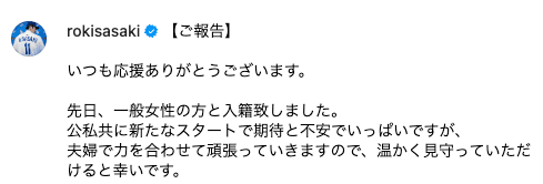 佐々木朗希さんの結婚発表はインスタグラムで公開されています。